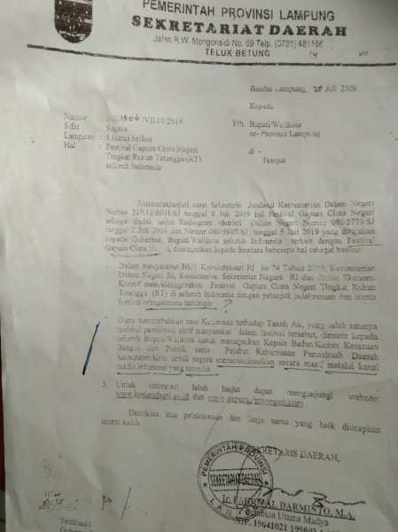 Surat dengan nomor 200/1506/VII.01/2019 itu berisikan dalam menyambut HUT Kemerdekaan RI ke-74 Tahun 2019, Kementrian Dalam Negeri RI, Kementrian Sekertariat Negara RI dan Badan Ekonomi Kreatif menyelenggarakan Festival Gapura Cinta Negeri Tingkat Rukun Tetangga (RT) di seluruh Indonesia