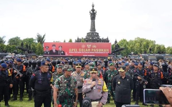 Bali ( Duta Lampung Online)-Kapolri beserta Panglima TNI memimpin apel gelar pasukan operasi Puri Agung 2022 dalam rangka pengamanan KTT G20, apel ini dilaksanakan sebagai langkah pengecekan akhir kesiapan pasukan, sarana dan prasarana sebelum melaksanakan pengamanan dilapangan (8/11/2022).