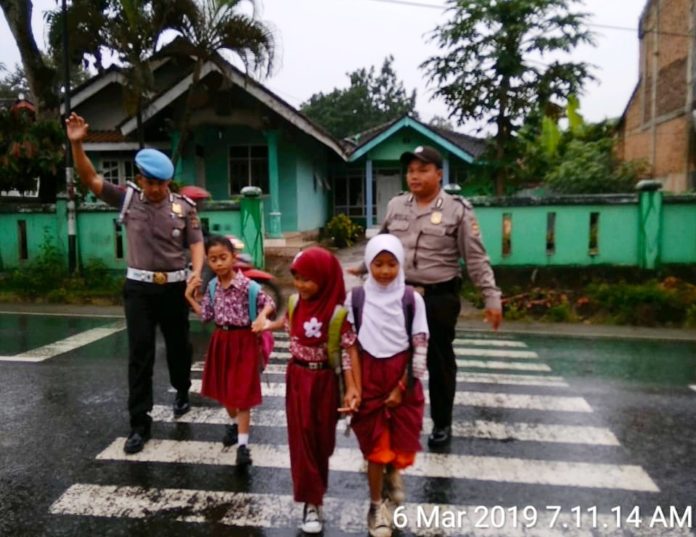 Pesawaran (Duta Lampung Online) – Kepolisian Resort (polres) Pesawaran melalu Polisi Sektor (polsek) Gedong Tataan memberikan pelayanan dengan mengedepankan para warga dan siswa-siswi sekolah untuk membantu penyeberangan di jalan raya saat masuk ke sekolah.