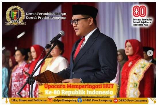 Gubernur Lampung Rahmat Mirzani Djausal menjadi Inspektur dalam Upacara Peringatan Hari Ulang Tahun (HUT) ke-80 Kemerdekaan Republik Indonesia. Berlangsung dengan penuh khidmat dan suka cita, Gubernur Rahmat Mirzani Djausal menyampaikan bahwasannya tema HUT RI tahun ini, yaitu “Bersatu Berdaulat, Rakyat Sejahtera, Indonesia Maju,” sebagai kompas arah pembangunan serta menekankan bahwa kemerdekaan yang diperjuangkan selama delapan dekade lalu harus diisi dengan kerja nyata dan pengabdian yang sungguh-sungguh “Sebagaimana dikatakan Bung Karno, ‘Bangsa yang besar adalah bangsa yang menghormati jasa pahlawannya.’ Maka hari ini, kita meneruskan perjuangan mereka melalui kerja nyata dan pengabdian,” ujarnya.