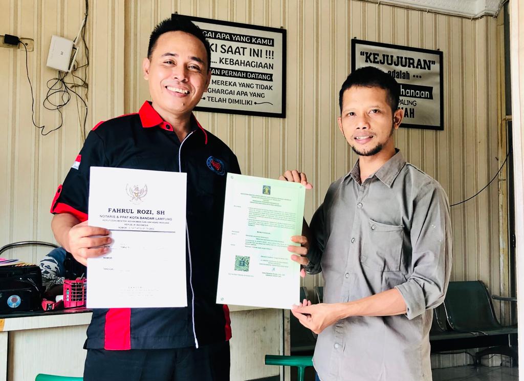 Badan Hukum Aktenotaris Fahrul Rozi, SH, No : 87 Tanggal 22-9-2022. Dan SK Kementrian Hukum dan HAM (AHU ) No : 0010136.AH. 01.07 Tahun 2022.